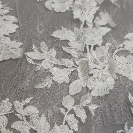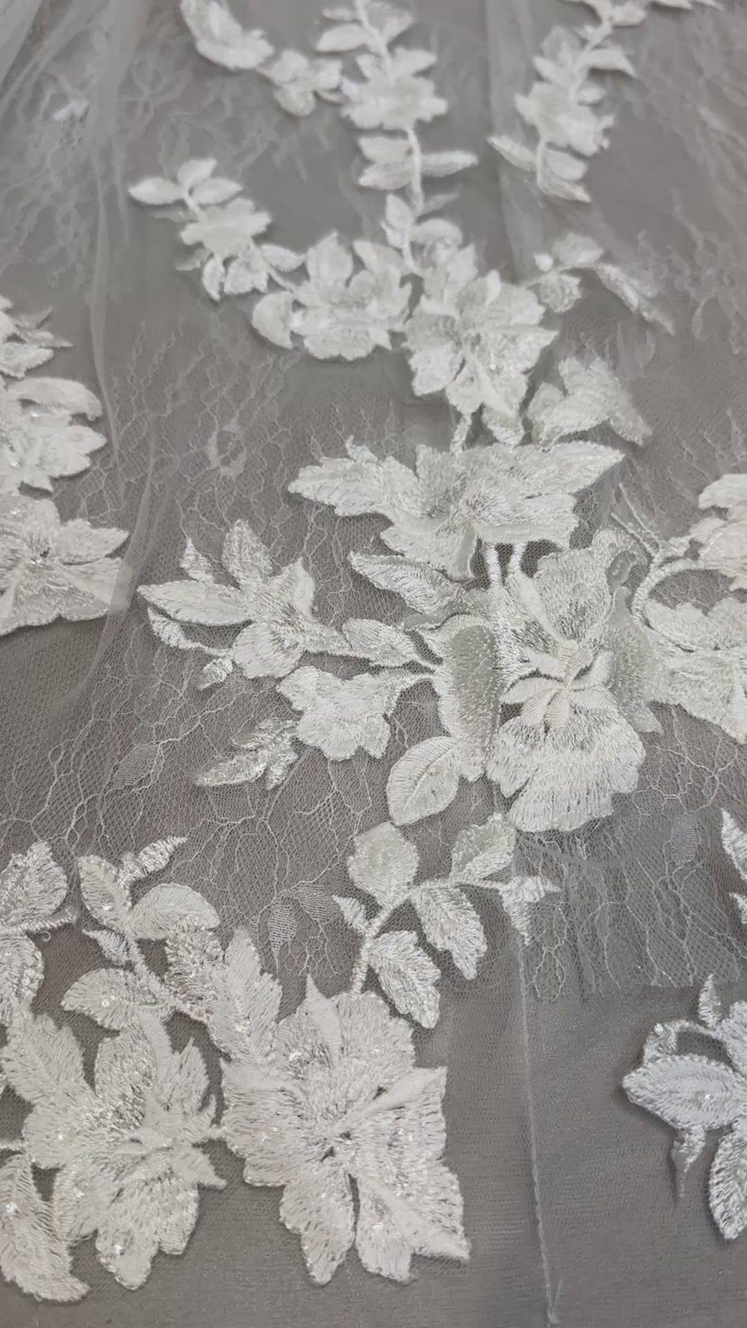 The Ayla Gown by Fleur&Grace Designs is a show-stopping mermaid wedding dress featuring intricate floral embroidery accented with sparkly sequin glitter. Designed for the modern bride who wants elegance and drama, this gown showcases a romantic sweetheart neckline with a plunging V-shape, structured with boning for support. Delicate off-the-shoulder long sleeves add a touch of vintage romance, while an illusion lace back with reinforced bones provides both comfort and shape. The figure-hugging mermaid silhouette flares into a graceful court-length train, finished with hand-sewn floral appliqués that catch the light. Perfect for brides seeking a luxury wedding gown, the Ayla Gown combines couture craftsmanship with timeless style for an unforgettable walk down the aisle.